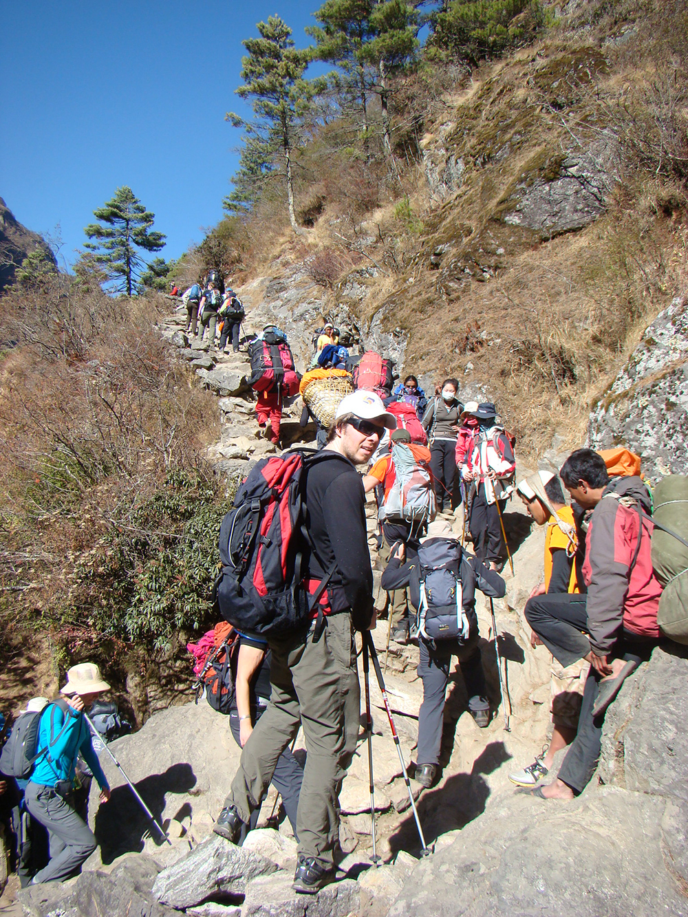After breakfast, we descend steeply through a beautiful forest of juniper, rhododendron, and fir to Tyanboche and then down again to Phunkitenga. After a welcome break and perhaps a cup of tea, we cross the Dudh Kosi and ascend to Trashinga. From here the trail contours high above the valley through Sanasa before returning to Namche Bazaar, where we spend the night.